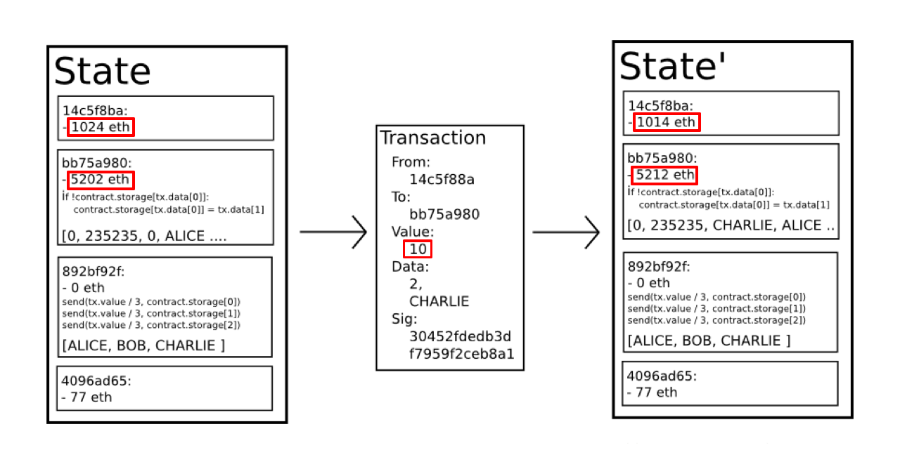 以太坊的架構類似銀行帳戶,有資料庫在記錄每個帳號和帳號的餘額,透過交易來更新。如下圖所示:地址 14c5f8ba 在一筆交易中發送了 10 個 eth 給 地址 bb75a980 ,於是在交易過後雙方的以太幣數量便被更新了。
