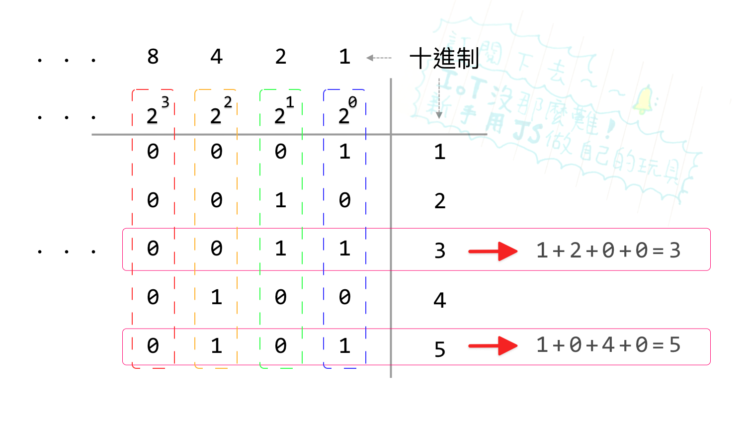 數字 5 在二進位表示法的話會變成「0 1 0 1」即「8*0 + 4*1 + 2*0 + 1*1 」