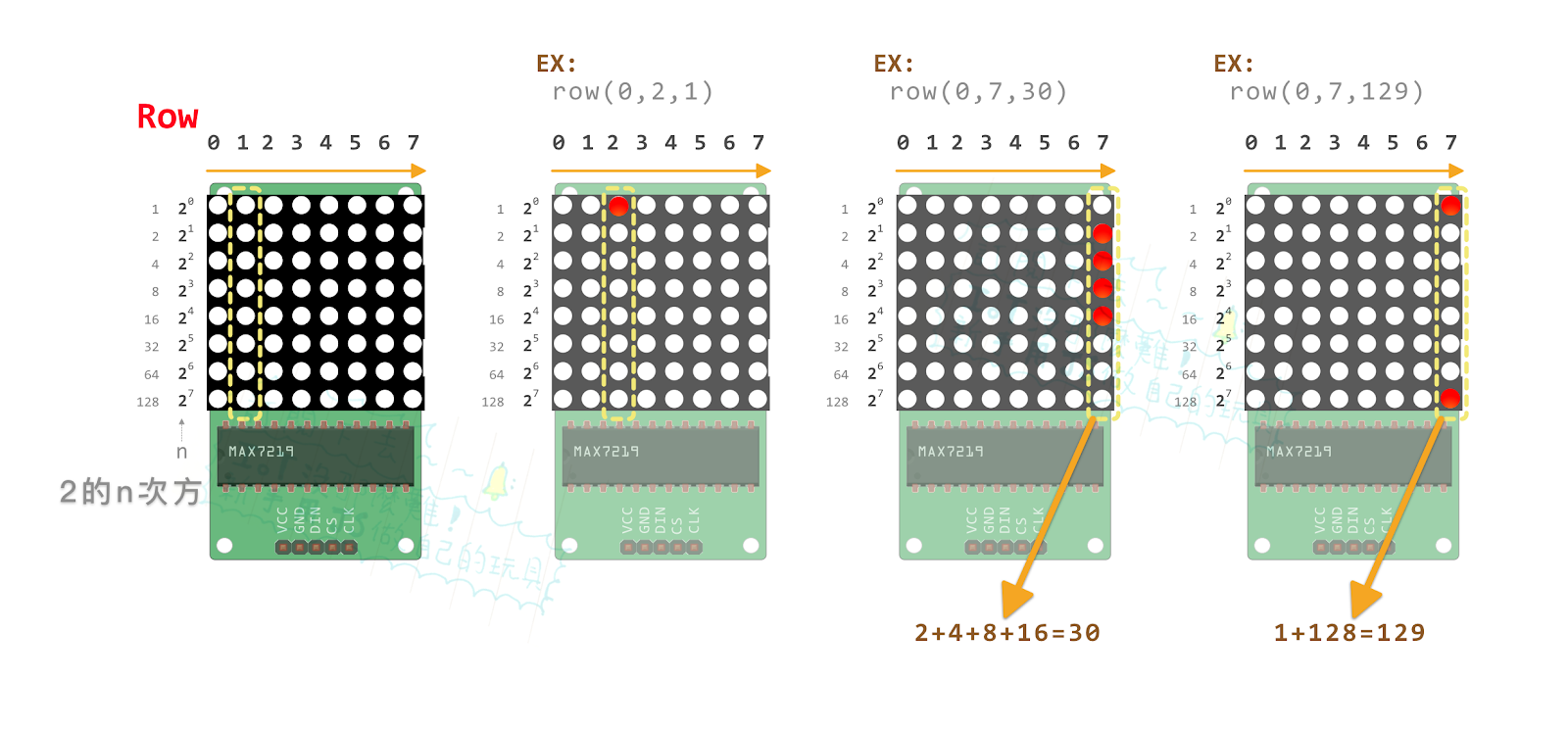 譬如來說,最左下角為起點(0,0),由上角為(7,7),這樣要讓任意哪一點亮就能簡單的操作!