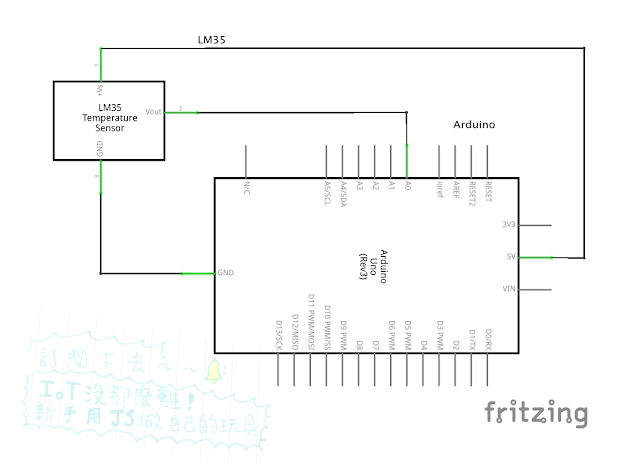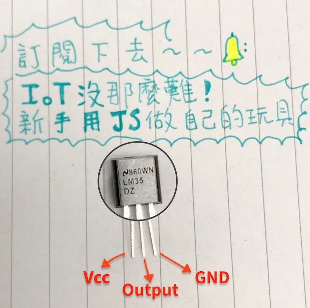 本魯也有買DHT 系列來實驗,不過測試發現用 Johnny-Five 好像還要再接一塊 Arduino 支援 I2C ,所以先拿LM35來寫~