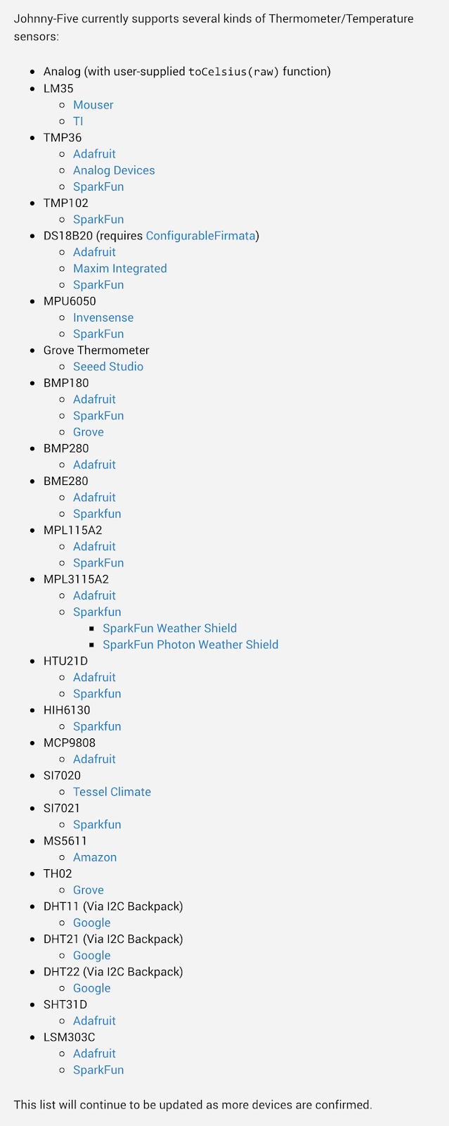 可以看到 Johnny-Five 支援非常多不同種類的溫度 Sensor,