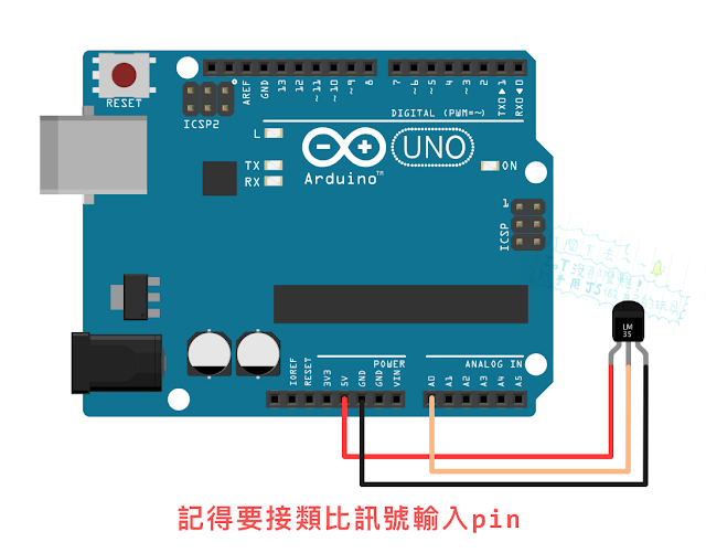因為溫度是連續的類比訊號,所以我們要把 LM35 的輸出腳接到Arduino的類比輸入 pin 腳
