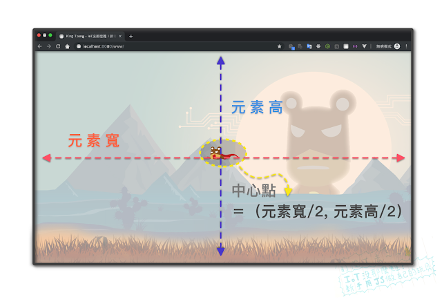 假設遊戲一開始熊俠設定在視窗中心點出發,首要我們要取得網頁的中心點位置,