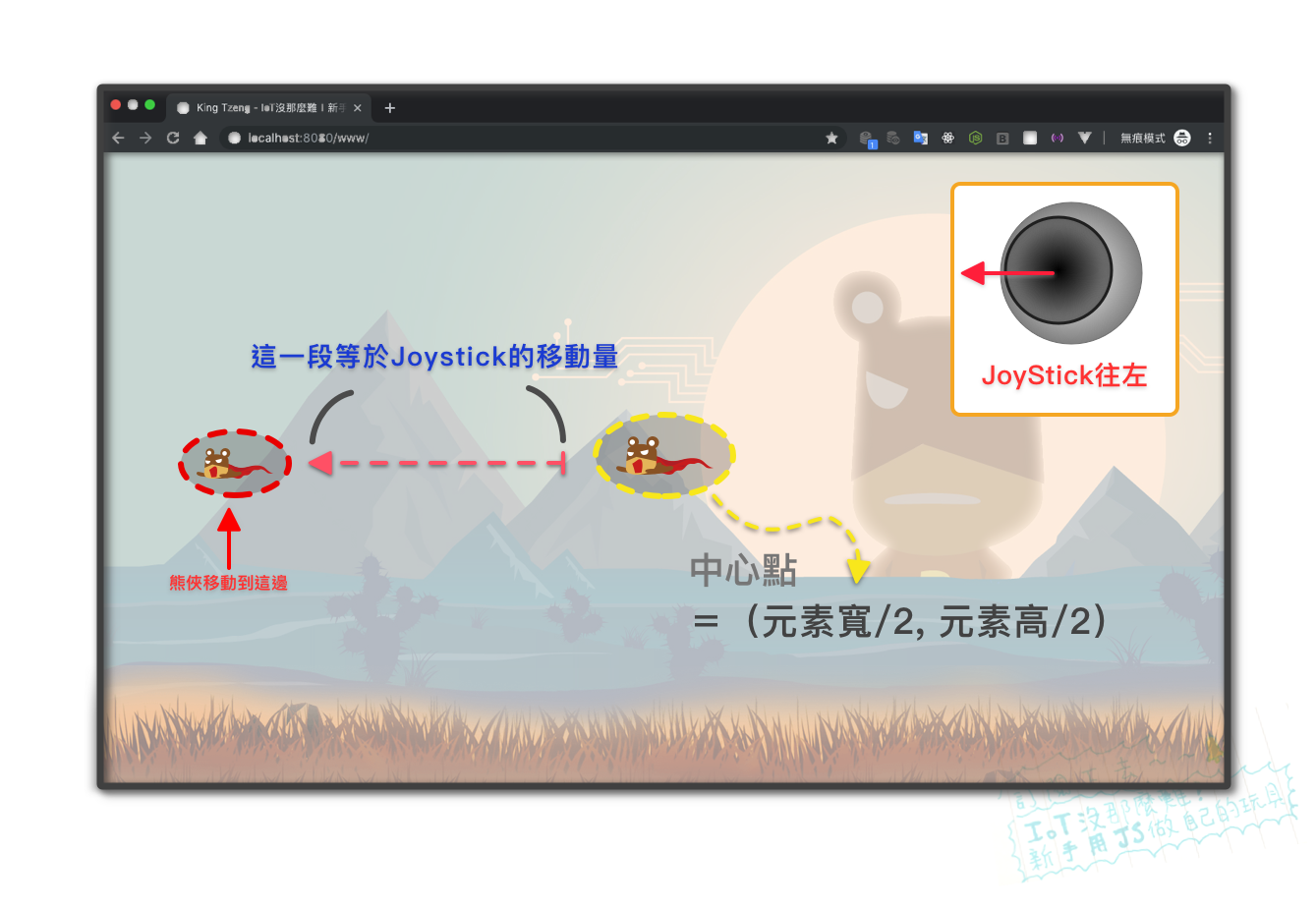- 熊俠的移動量變數 = Joystick 回傳的數值 * 視窗中心點位置;