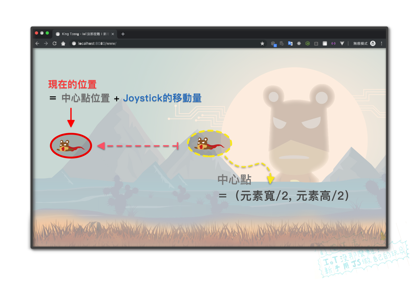 - 當前熊俠的位置 = 視窗中心點 + 熊俠的移動量變數
