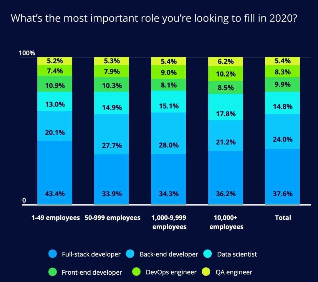 HackerRank 的《2020 年開發者技能報告》(2020 Developer Skills report) 中的圖表顯示,對於較小的公司(少於 50 名員工)來說,43% 的公司認為全棧開發者是他們最想僱傭的人。