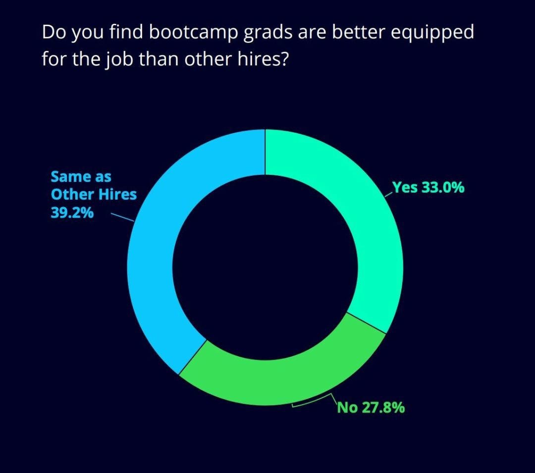 上圖顯示,大多數招聘經理認為,程式設計訓練營的畢業生與其他人勝任其工作的能力是差不多的。