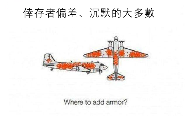 在二戰期間,人們發現倖存的轟炸機中,機翼中彈的數量很多,而機身中彈的卻很少。因此人們認為我們應該加固飛機的機翼,其實不然,就是因為機翼中彈多還能飛回來,所以機翼中彈並沒有影響飛機返航;而機身中彈的少則說明了子彈打中機身對飛機的影響更大,導致飛機不能返航,在這個飛機問題中,只統計到了倖存下來的飛機,以此下結論,是不正確的。