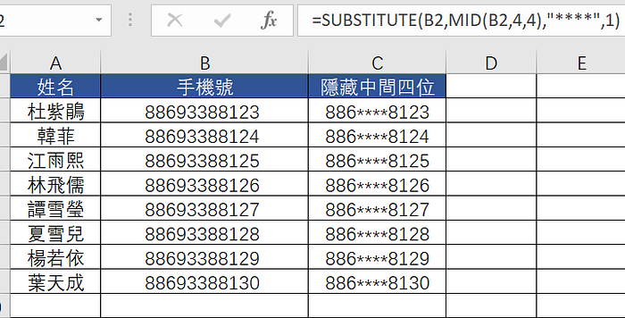 語法:=Replace(指定字串,哪個位置開始替換,替換幾個字元,替換成什麼)