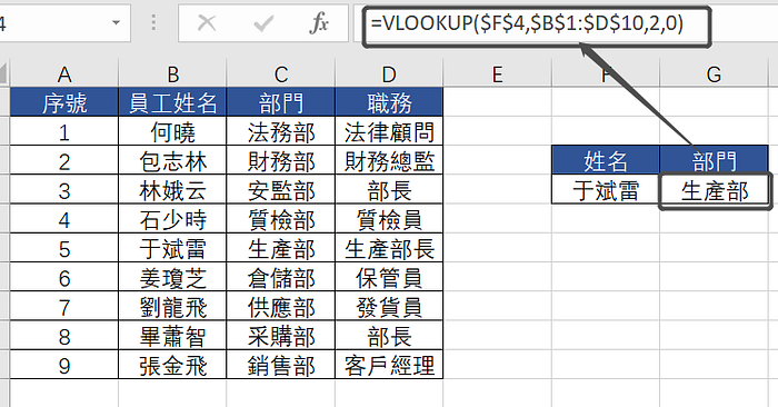 語法:=VLOOKUP(要查找的值,要在其中查找值的區域,區域中包含返回值的列號,精確匹配或近似匹配 — 指定為 0/FALSE 或 1/TRUE)。