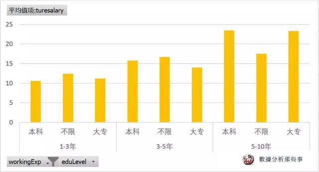其他的分析過程就不多做贅述了,主要是使用樞紐分析表和資料透視圖進行多維度(城市,學歷,工作經驗)的分析,沒有其他複雜的技巧。