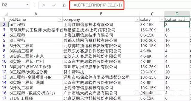這裡,在新增資料列,平均薪水,來近似代表實際的準確薪資。平均薪水=(薪水下限+薪水上限)/2,即可得到每個崗位的平均薪水。