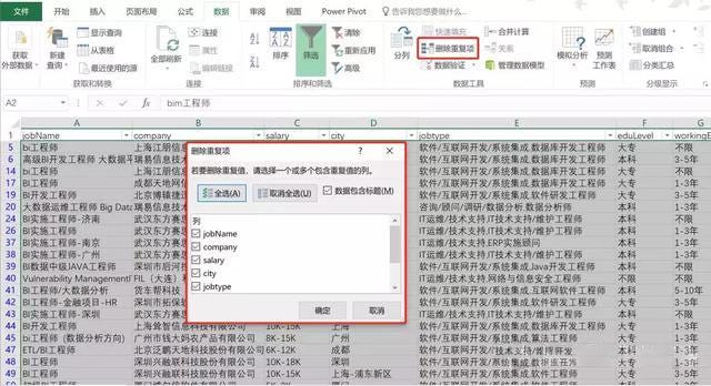 發現jobName列裡面有一些類似BIM工程師的崗位資訊,這些應該都是土木行業的工程師,爬去時沒做過濾,還有包含“bim”“BIOS””BIW”等欄位。
