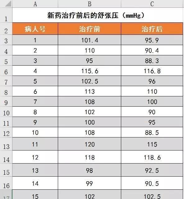 某藥廠研發了一種能夠降低血壓的新藥,現在為了瞭解該藥的療效,隨機抽取了15名高血壓患者,並得到他麼在使用該藥治療前後的舒張壓資料,如下圖所示,現在需要判斷:該藥是否有效?如果有效,是否能夠讓高血壓患者的舒張壓平均降低6.5mmHg?