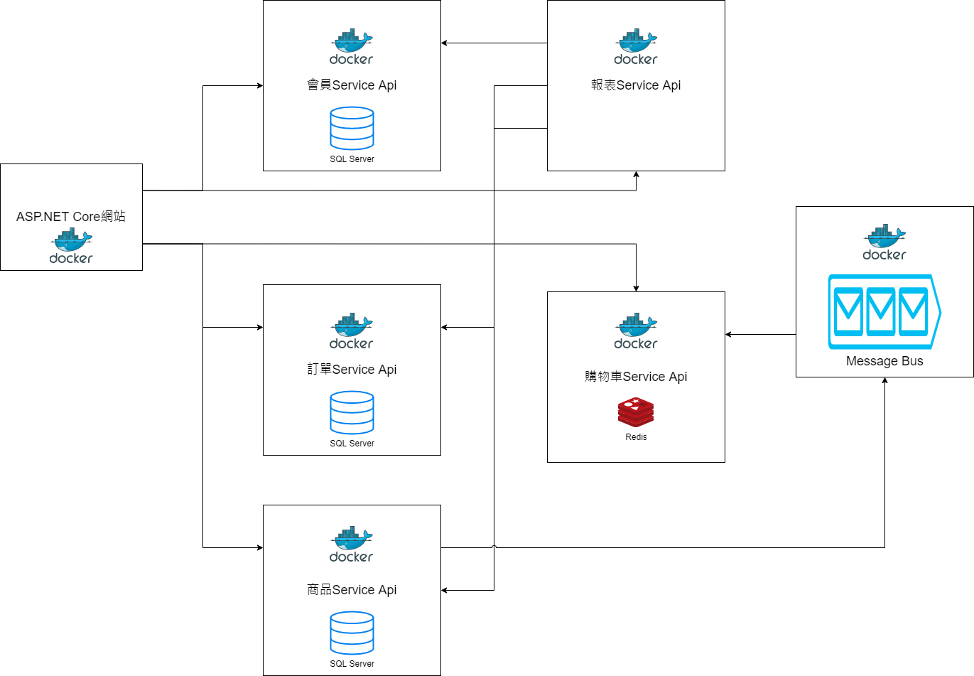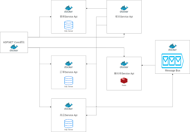 架構為簡單的微服務架構,每個服務各自起一個Docker Container,再透過Web API/Message Queue等方式做資料傳送。每個服務的技術加起來真的不小,包含ASP.NET Core、Redis、SQL Server、Message Queue,希望最後能如期完成這系列的文章!