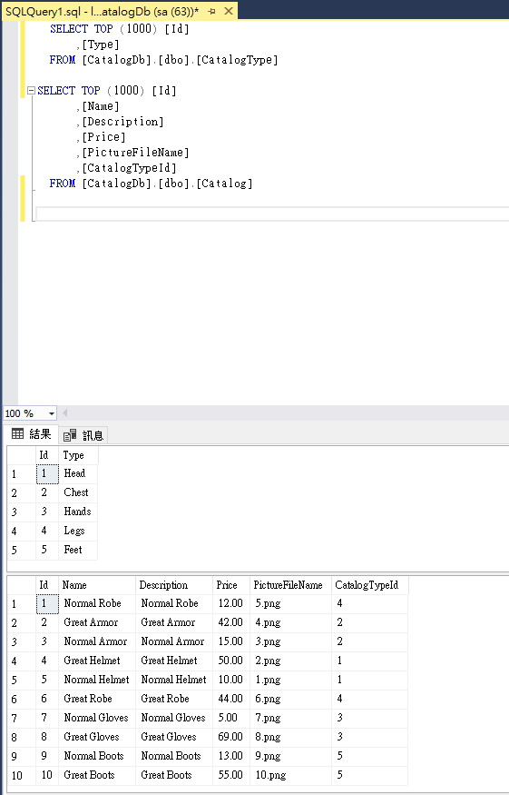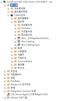 成功的話,用SSMS檢查,可看見資料庫CatalogDb和2個表格Catalog和CatalogType,如圖3。