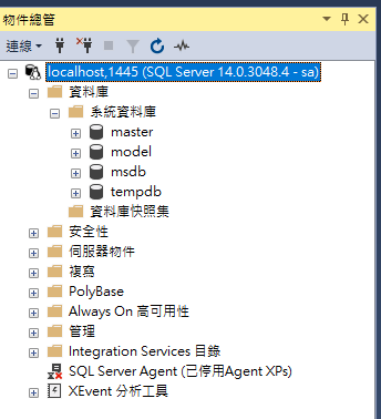Docker將建立一個SQL Server的Container,此時開啟SSMS,登入的伺服器名稱為 localhost,1445 (要有逗號並串接port),如圖1,代表Docker Container的SQL Server可使用。