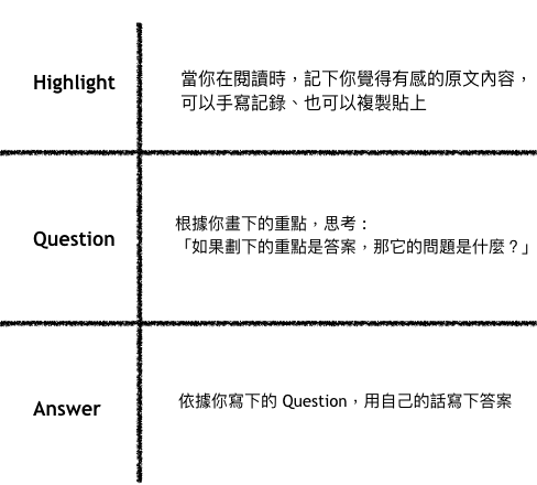 • Question:根據你畫下的重點,思考「如果劃下的重點是答案,那它的問題是什麼?」