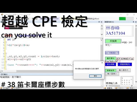 解題:題目是有關於笛卡爾座標系的步數相關定理,而題意則是說提到了笛卡爾座標,請嘗試撰寫程式,輸入開始的座標與終結座標,計算出如果初始地從開始座標出發,當抵達至終結座標時,總共會移動了多少步數,這題使用公式解會算地比較快,而且,程式碼也會儘量地相較於普通方法來說,語法會相當簡潔,這題也可以先讀入測資,然後套用公式就可以得到答案