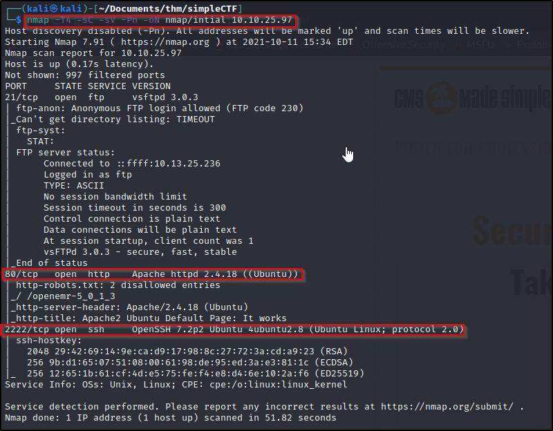 由上圖所示,我們可以看到 port 端口 21 (FTP)、80 (HTTP) 和 2222 (SSH) 是開放的。