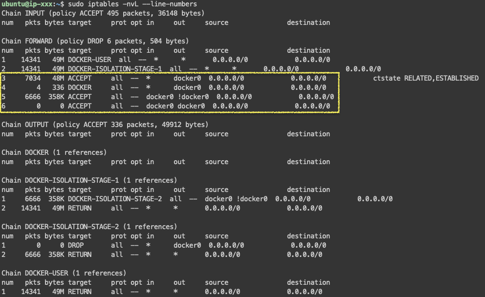 6        0     0 ACCEPT     all  --  docker0 docker0  0.0.0.0/0            0.0.0.0/0