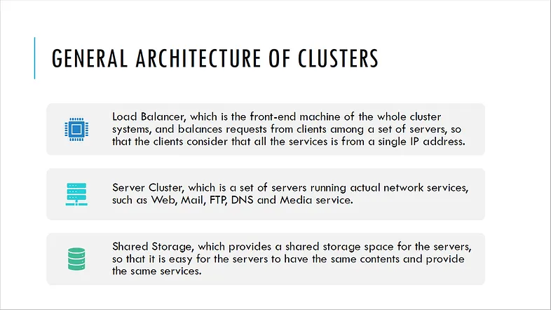 我們習慣把 Server Cluster 稱之為 Real Server 意即實際提供運算資源的伺服器,共用儲存體則是看您的應用而決定,最常見的就是各種類型的資料庫與網路儲存裝置(NAS)或者分散式檔案系統。