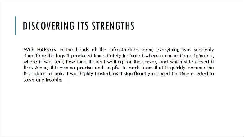 基礎設施團隊有了 HAPrxoy 之後,一切都變得簡單起來。它產生的日誌立即表明了連結的來源,發送到哪裡,等待伺服器花了多長的時間,以及伺服器端與使用者端哪一方先關閉了它,顯著地改善解決問題所需的時間。