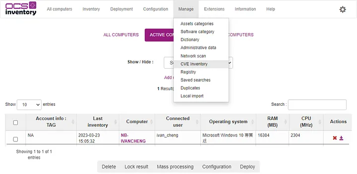 只要整合 CVE-Search 的功能,OCS Inventory 可以每天把盤點到的所有軟體與 CPE 46 萬多筆的受漏洞影響的產品進行比對,然後告知您是哪些 CVE 漏洞與資訊,可以說是相當實用的功能,大家一定要試看看。