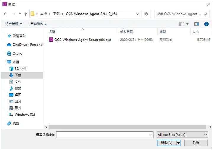 選擇剛下載的 OCS-Windows-Agent-Setup-x64.exe 檔案,此項為必填項。