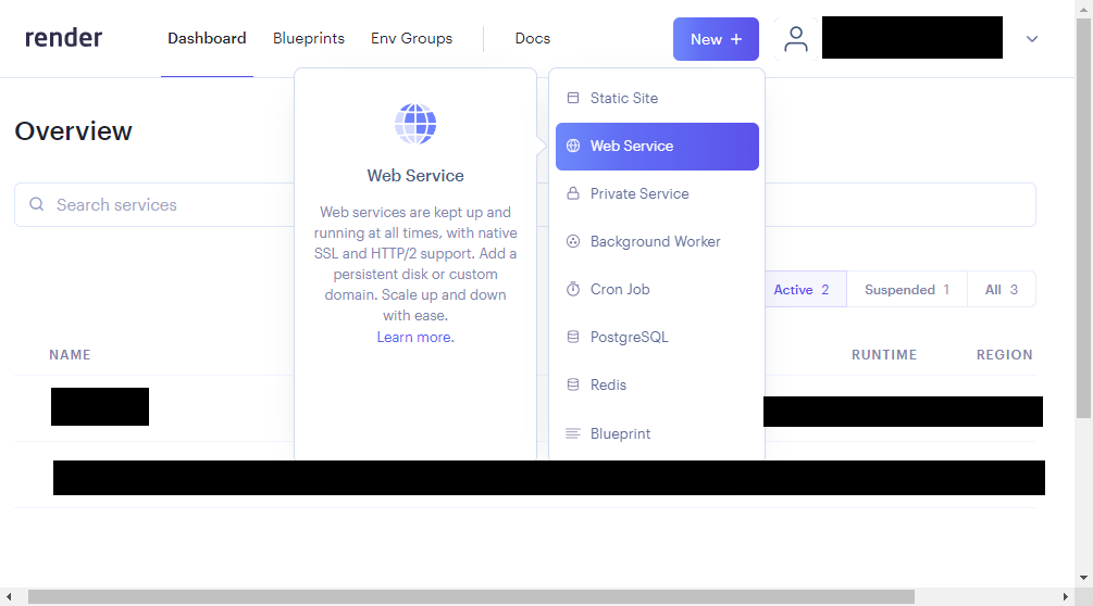 對新手來說,如果只是要做 side project,或是簡單測試用,在選擇部屬平台時,費用往往是第一個要考慮的點,其次才會是效能、容量、使用難度等其它項目,因此,render 就會是一個好選擇。它可以選擇的部屬的服務有很多,其中,如果要部屬後端程式,選擇 Web Service 是做合適的選擇。