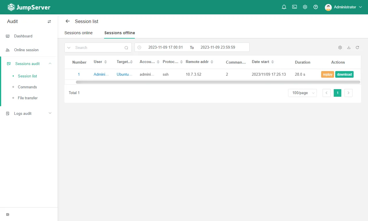 切到 Audit 點選 Session Audit 的 Session List,切到 Session Offine 就可以看到之前的連線紀錄了。
