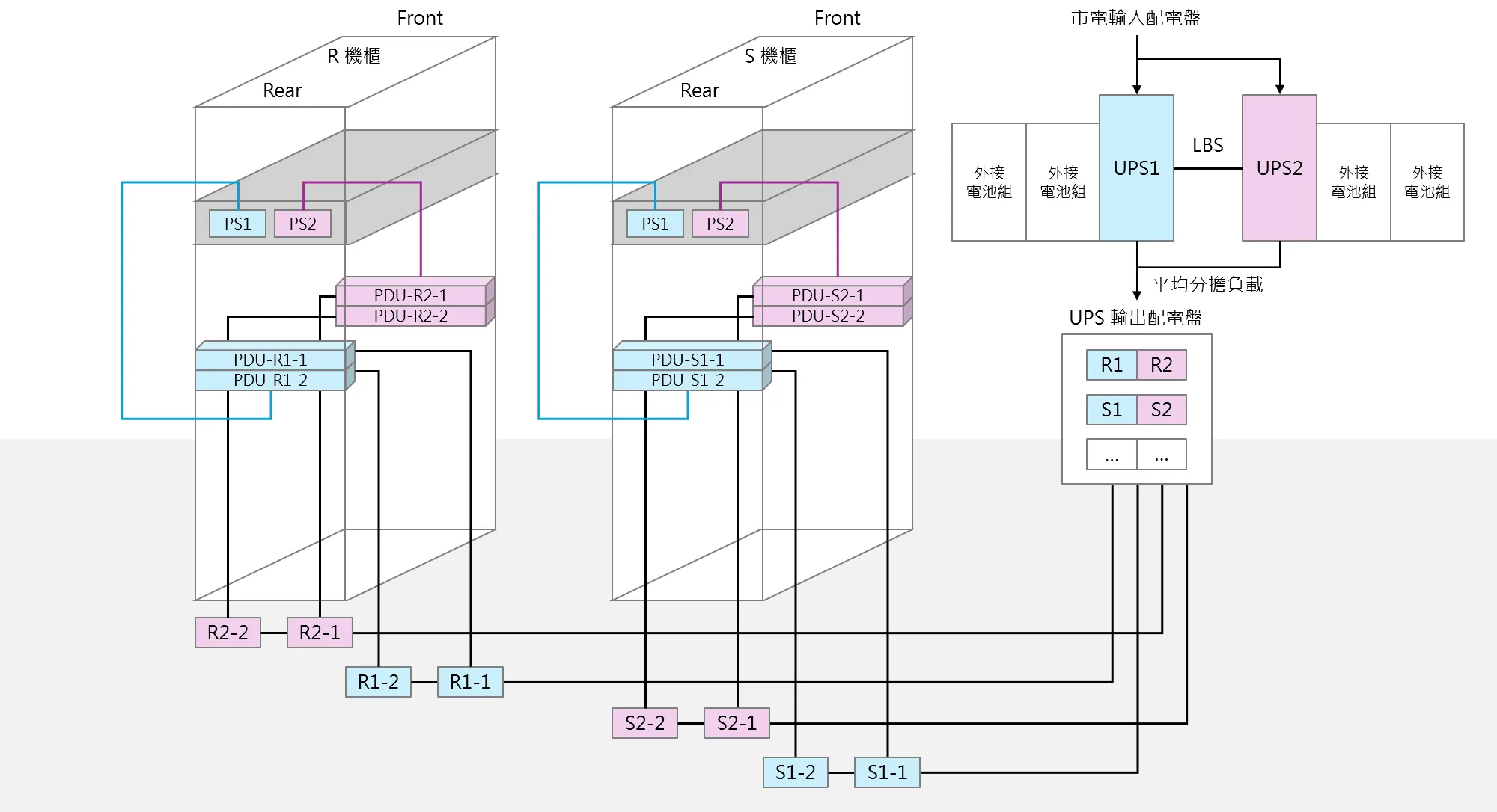 機架式伺服器皆有設計兩個電源插口,再將這兩個接口分別連接到前後兩組 PDU 中。這樣即使一條電源路徑出現故障,伺服器仍能夠通過另一條路徑獲得電力,確保持續運行。