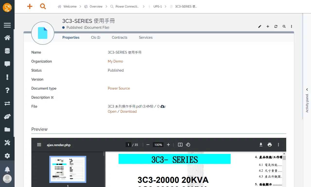 可以在 Documents 頁面上傳該 UPS 的相關文件,例如使用手冊。