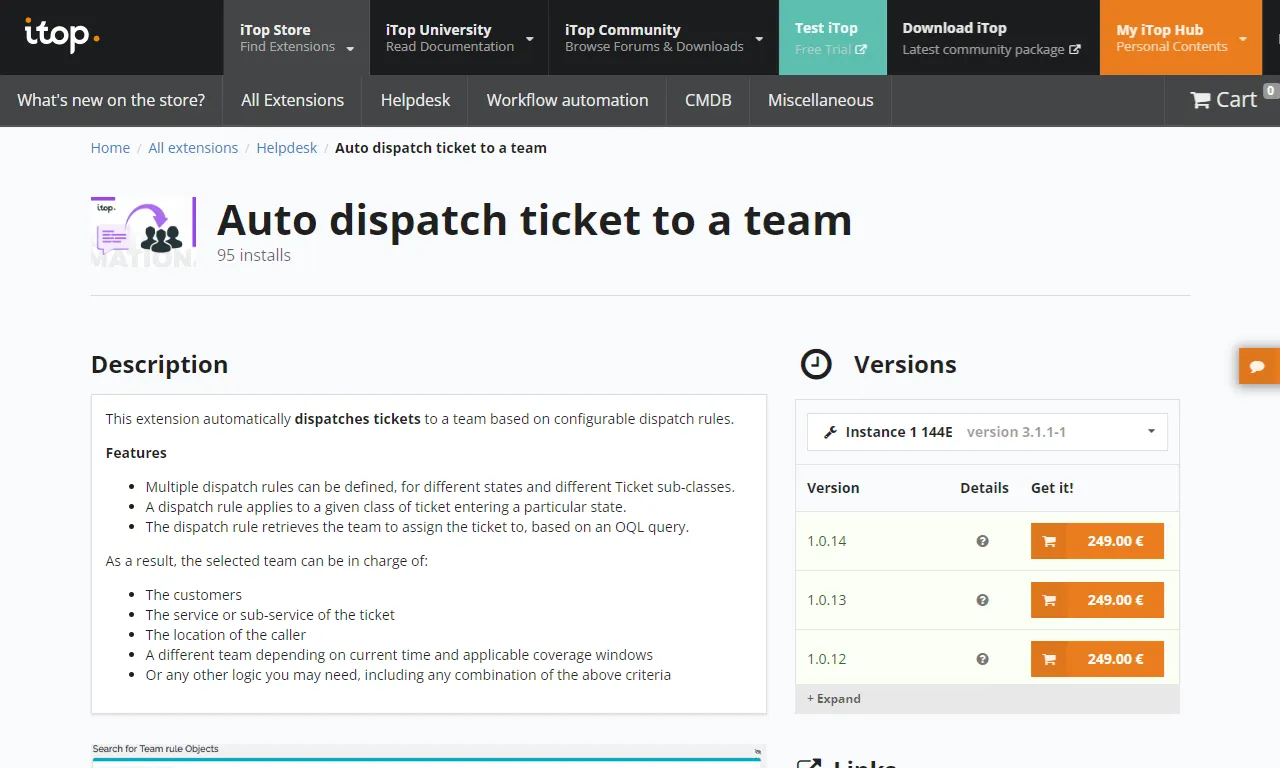 點選 iTop Store 找到 Auto Dispatch Ticket to a Team 外掛,我們使用 1.0.8 Version,點選 Install。