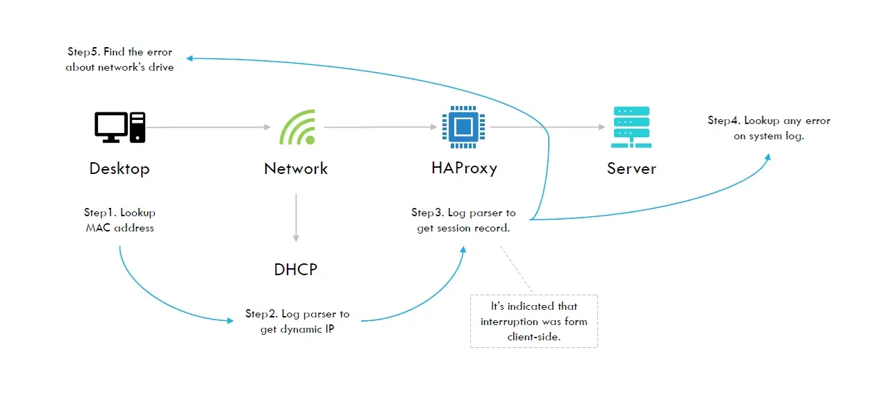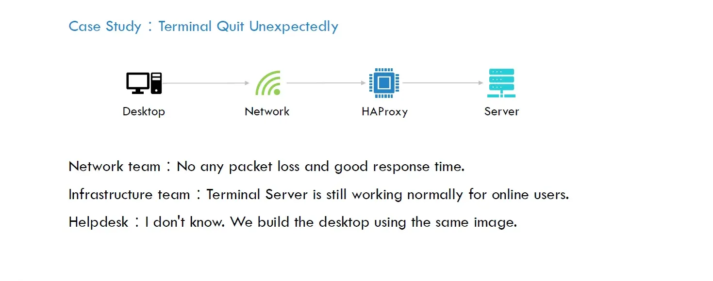 Application Team:該使用者連線到的終端伺服器也都正常運作,看看其他線上用戶不都跑得好好的,是不是網路問題啊。