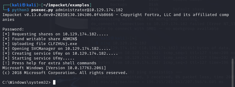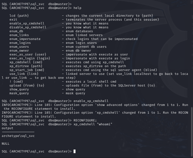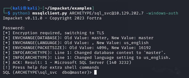 mssqlclient.py 進行身份驗證並存取 SQL Serverpython3 mssqlclient.py ARCHETYPE/sql_svc@{TARGET_IP} -windows-auth