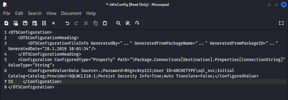 在 prod.dtsConfig 配置文件中,發現 SQL Server 使用者 sql_svc 的明文密碼。