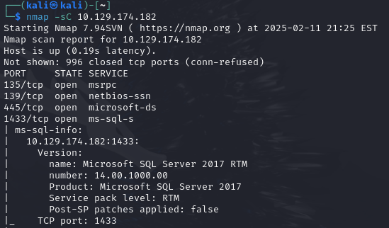 在進行滲透測試時,初步偵查能夠揭露目標系統的潛在弱點。本次分析中,我們發現目標伺服器開放了 SMB(Server Message Block)服務於 445 或 139 端口,並於 1433 端口運行 Microsoft SQL Server 2017