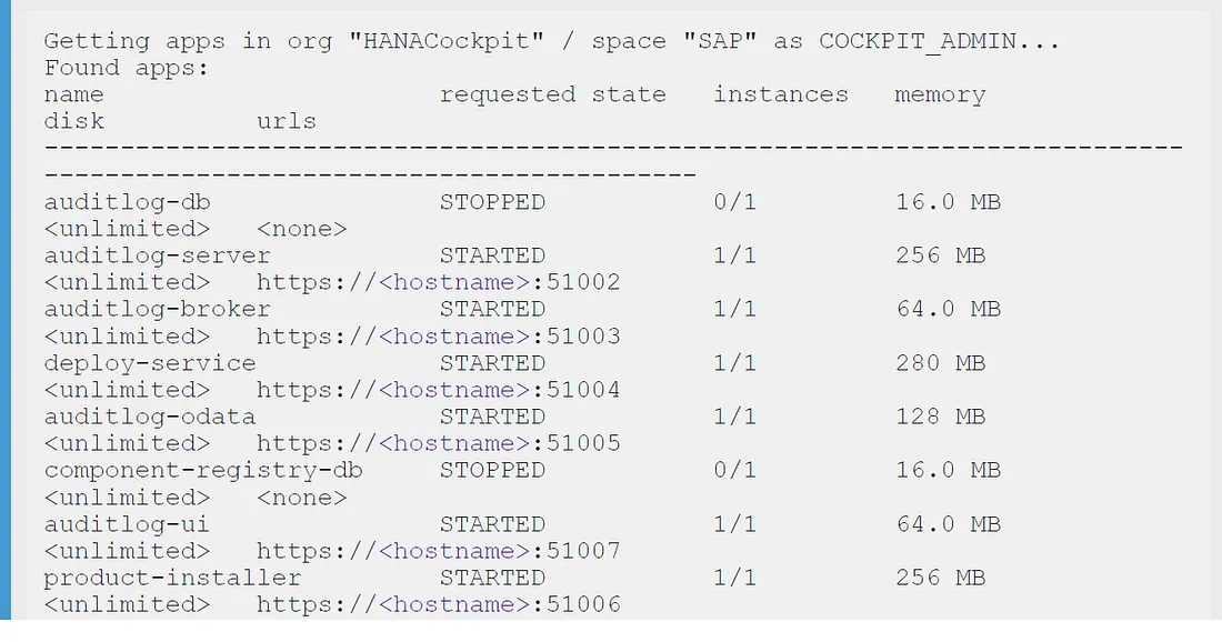 step 5: 輸入xs apps, 會列出一堆網址尋找 cookpit-admin-web-app(cockpit mamager) and cockpit-web-app(cockpit)這兩個字串前面帶的網址。如下示意圖