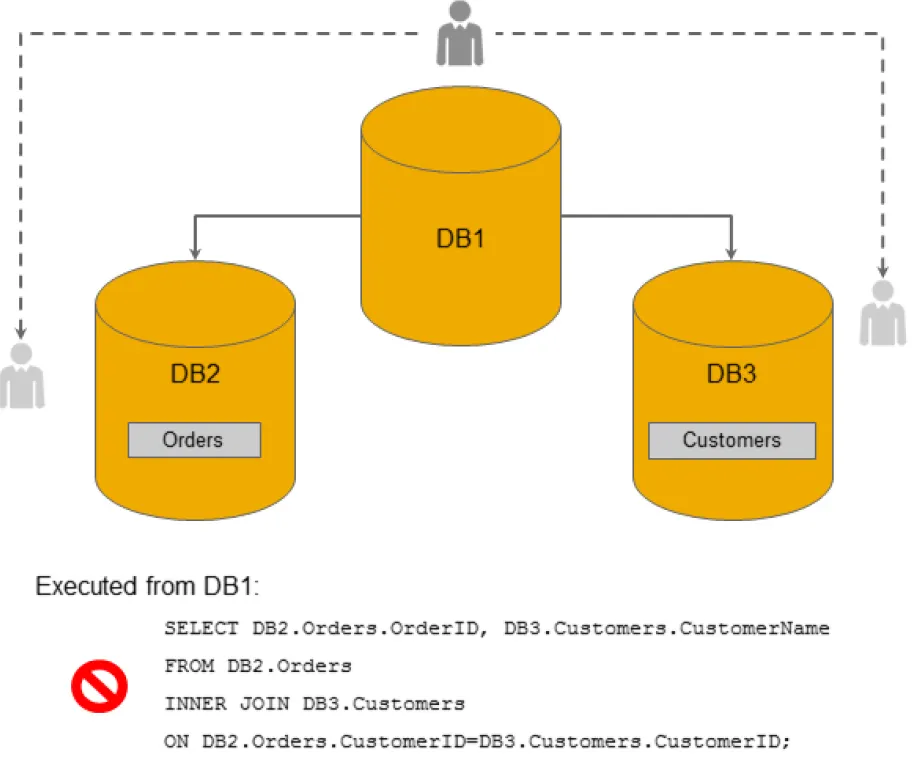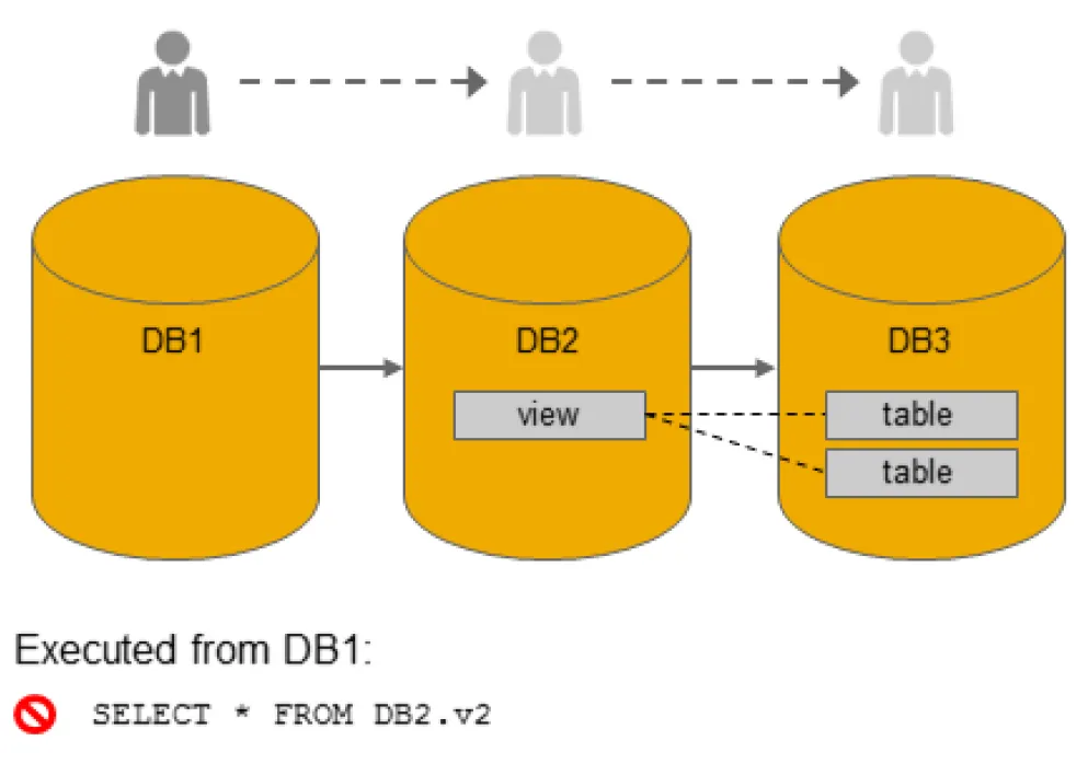 上圖中, DB 1 與 DB 2 及 DB 3 個別開啟的corss-database access功能,但沒有 DB 2 to DB 3也開啟。所以從 DB 1要從另兩個DB讀取資料就會無法讀取。可能會收到"execution plan aborted or current operation canceled by request and transaction rolled back"類似的錯誤訊息。