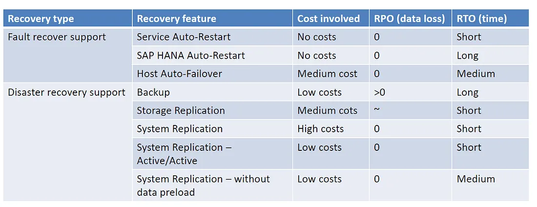 上圖中,Fault recovery的第一項是HANA中的Servic restart(HANA有watchdog系統).這個重啟很快RPO/RTO大都不會很有因為重啟特定服務只會重新載入該項服務的data進到memory,但若是整個HANA系統重啟哪RTO就要花費很多時間了。至於為什麼會花時間可以參考其他HANA的篇章。最後是主機的failover,花費的時間不會比System restart還要多。不過最後還是要說這一切取決於我們的硬體,效能越好當然開機時間越快。但也與整體架構設計有關。Disaster Recovery就比較多樣了,另外System Replication後面會提及。