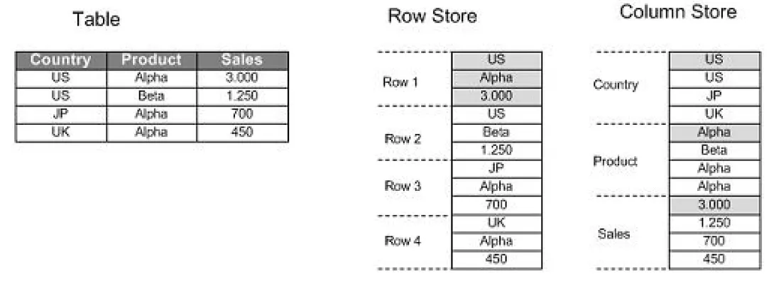 HANA同時可以支援 row based and column based的資料型態。row based的資料型態就如大家所知的table(一個有順序的紀錄資料表)。但以電腦的memory結構 來說column based的分析效能會比row based的效能來得更好,並且能夠比row based的資料提供更有效的資料壓縮,因為column based的資料性質要嘛不是一直重複要嘛就是相近的值,可參考下圖範例