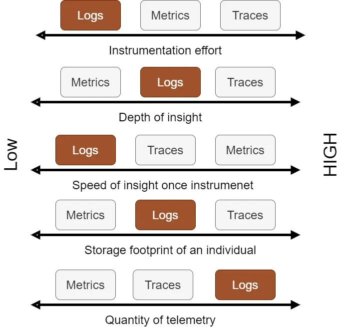 下圖顯示如何在生產環境中收集telemetry是cost、storage和performance(CPU、memory和request latency)overhead與資訊收集的價值之間的折衷,通常是在它修復緩慢或錯誤的responses方面的呈現度或有用程度。