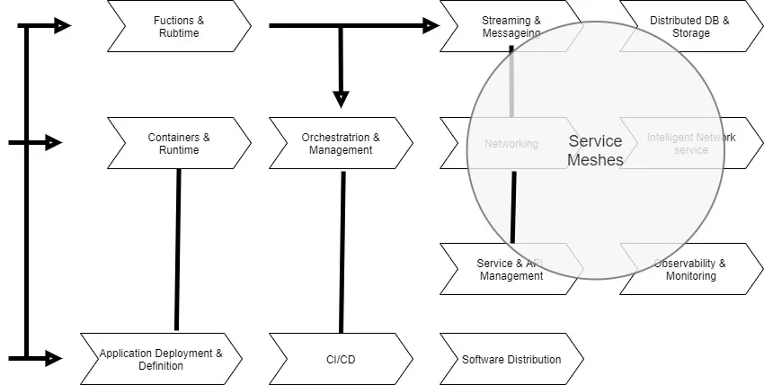 公有雲、混合雲和私有雲顯然是雲原生定義的核心。簡而言之,雲端就是由軟體所定義的基礎設施。使用 API 作為基礎設施的介面 是一個主要的雲端概念。原生整合工作負載使用這些 API(或這些 API 的抽象),而不是不了解其基礎設施的非原生工作負載。隨著“雲原生”定義的演化,雲端服務本身也在演進。從廣義上講,雲端服務已經從 IaaS 發展到託管服務,再到serverless產品,鑑於大多數 FaaS的運算在容器內執行,這些 FaaS 平台可以在Service Meshes上運行並受益於可觀測性。