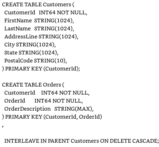 Cloud Spanner 最多支持七層交錯table。 使用 CREATE TABLE 語句中的 INTERLEAVE IN PARENT 子句交錯table。 例如,要將訂單(order table)與下訂單的客戶(customer table)交錯,我們可以使用以下命令: