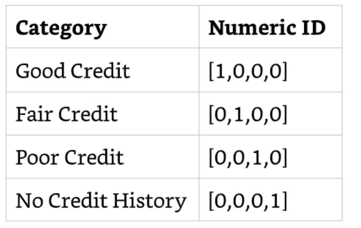 另一種常見的特徵工程技術是one-hoting encoding。 此過程將分類值列表映射到一系列二進制數,其中單個值設置為 1,所有其他值設置為 0(如下圖範例)。