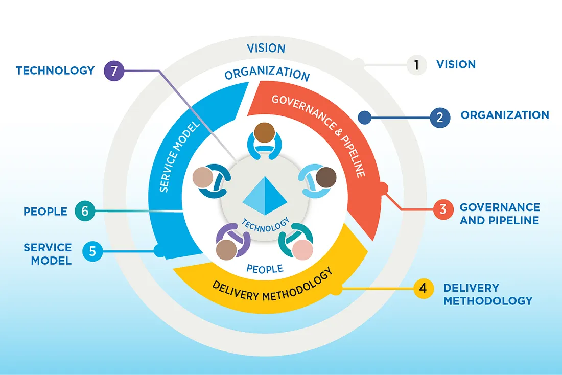 所謂的七種運作ROM基礎分別是,願景(Vision), 組織(Organization), 治理與傳遞管道(Governance and pipeline), 交付方式(Delivery Methodology), 服務模式(Service Model), 人員(People), 技術(Technology)。