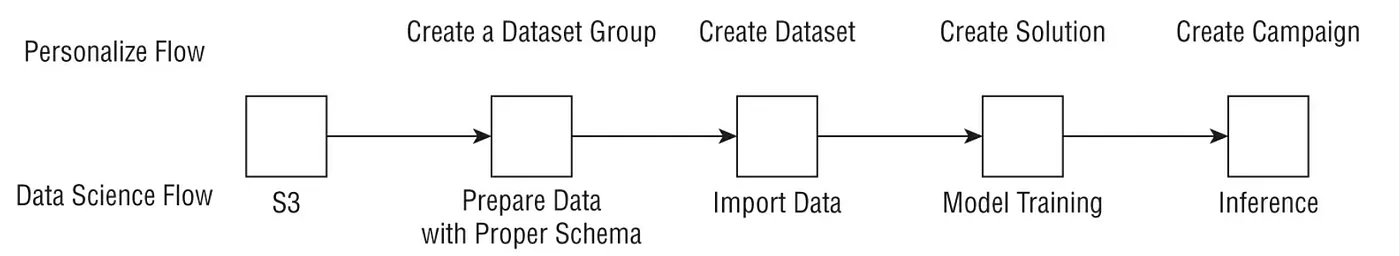 AWS Personalize 使用一些獨特的術語,並且能夠對應到一般性的資料科學工作流程(如下圖)。