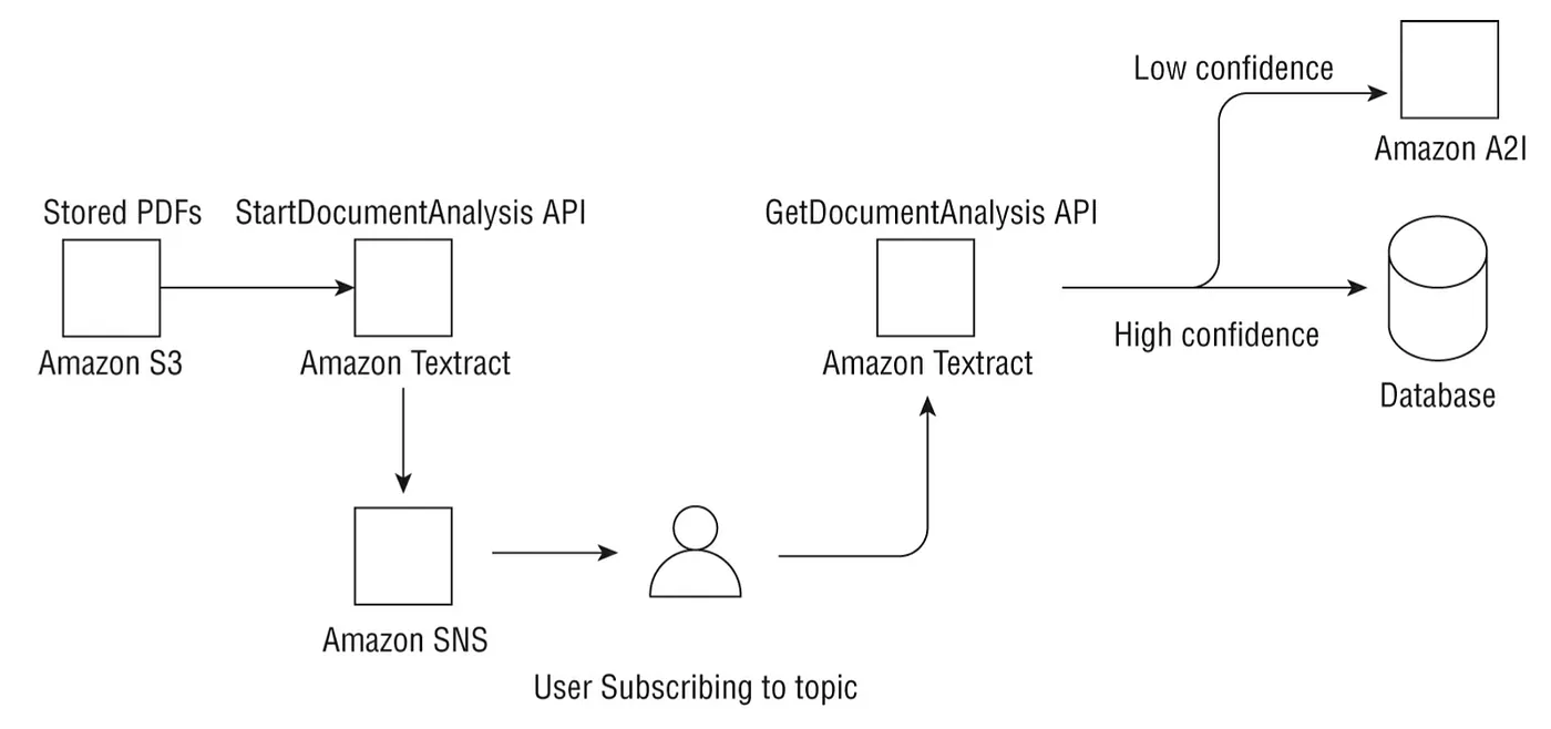 對於 PDF 檔案或大於一頁的文件,需使用非同步 API StartDocumentAnalysis 和 StartDocumentTextDetection 。由於偵測大型文件中的文字可能需要一些時間,Textract 將在背景處理文件並將完成狀態發送到 SNS topic。這個topic的subscriber隨後將收到作業已完成的通知,並可通過使用 GetDocumentAnalysis 或 GetDocumentTextDetection API 查看結果。然後可以將作業的結果存儲在 DynamoDB table、S3 bucket。
