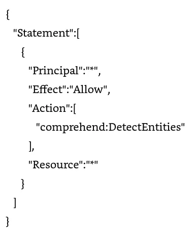 讓我們看一些關於設定VPC endpoint更細節的部分,我們使用endpoint要來access Comprehend API。我們可以在CLI介面輸入 command: create-vpc-endpoint或在AWS的 Comprehend console。不管是哪一種,我們都需要提供 VPC ID,會使用endpoint的subnets,還有這個subnet中endpoint netowrk interface會關連到的security group。在以下範例中為了限制 VPC 中的entity 只能呼叫Comprehend API的 DetectEntities API call,我們可以加上以下的endpoint policy: